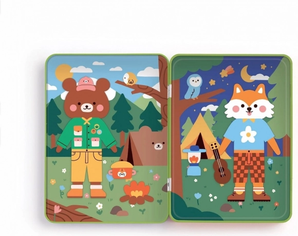 Oblékejte medvěda a lišku přímo v prostředí kempu. Scény podporují fantazii a snadno inspirují k vyprávění.