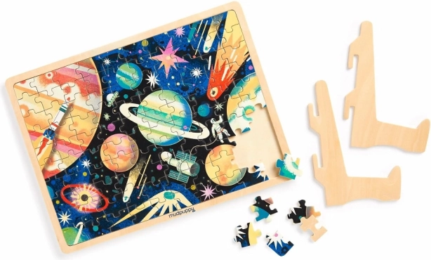 Objevte zábavné a vzdělávací dřevěné puzzle s motivem vesmíru, které děti vtáhne do světa planet, raket a astronautů. Skládanka ze 100 dílků nabízí kvalitní dřevěné zpracování, živé barvy a praktický stojan pro vystavení hotového obrázku – skvělá dekorace i dárek pro děti od 5 let.