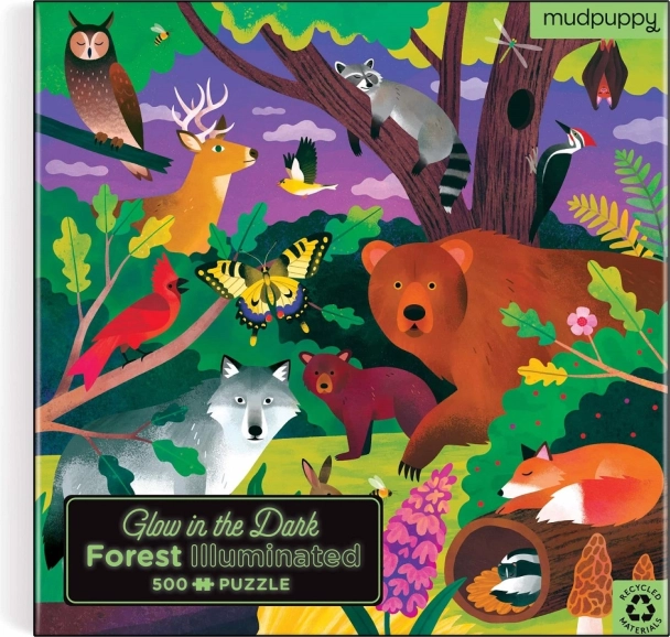 Sestavte si kouzelnou lesní scénu s puzzle MUDPUPPY o 500 dílcích, které po zhasnutí světel svítí ve tmě. Kvalitní zpracování z recyklovaného papíru, precizní výsek a matná povrchová úprava pro věrné barvy a detaily. Součástí je návodný obrázek a odolná pevná krabice pro snadné ukládání. Ilustrace: Kaley McKean.