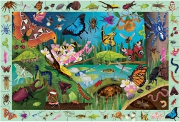 Vstupte do pestrého světa hmyzu – od atlasové můry přes světlušky až po berušky. Toto 64dílné puzzle přináší dětem zábavu i učení: nejprve složí obrázek plný detailů a poté v rámečku kolem scény vyhledávají více než 40 různých druhů. Díky matnému povrchu a pevné zadní straně se dílky příjemně drží a krásně lícují.