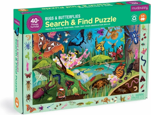 Objevte hravou skládačku pro děti od 4 let: 64dílné puzzle s motivem hmyzu, které rozvíjí pozorovací schopnosti, trpělivost a jemnou motoriku. Po složení děti hledají více než 40 skrytých brouků a motýlů v rámečku – zábava na dvakrát! Vyrobeno z recyklovaného papíru s kvalitním potiskem a matnou úpravou pro krásné barvy.