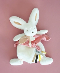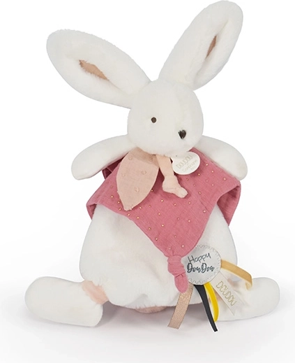 Tato dárková sada Doudou přináší hebkého plyšového zajíčka s muchláčkem, který potěší miminka i rodiče. Stylový design ve starorůžové barvě se sladěnými tkanými stuhami a bambulkou z něj dělá něžného společníka na usínání i denní mazlení. Díky kvalitnímu zpracování je hračka bezpečná, odolná a ideální i jako elegantní dárek.