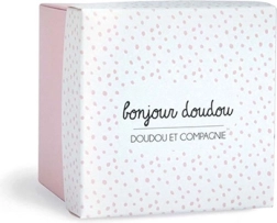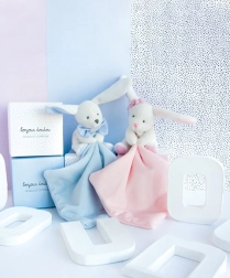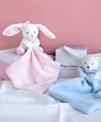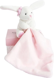 Tento roztomilý králíček v elegantní dárkové krabičce je nezbytností pro každé novorozené miminko. V bílém provedení s růžovým muchláčkem je králíček extrémně měkký a rychle se stane nejlepším společníkem pro vaše dítě. Malá dečka v tlapce slouží jako snadno uchopitelný muchláček.
