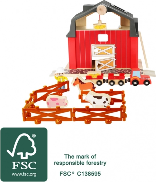 Objevte kouzlo venkova s touto kvalitní farmou z 100% FSC dřeva a plastu. Sada obsahuje stodolu s funkčním jeřábem, traktor s přívěsem a magnetické balíky sena. Děti si užijí bohatou imaginativní hru, rozvíjí jemnou motoriku, koordinaci a komunikační dovednosti. Nechybí zvířátka, ohrada ani otevírací vrata – na této farmě je zkrátka stále živo!