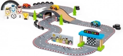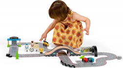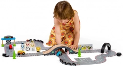 47 dílná sada zahrnuje závodní auta, pódium pro vítěze, nadjezd a další.