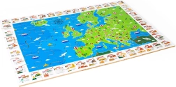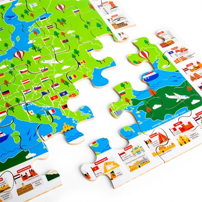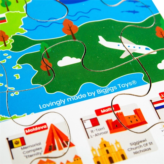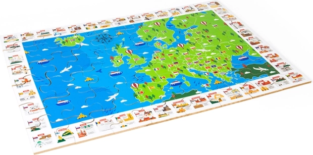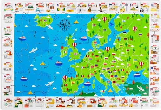Barevná mapa evropy s vlajkami a ikonickými památkami motivuje děti objevovat státy a jejich polohu. Skládání rozvíjí logiku, orientaci i slovní zásobu.