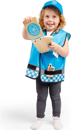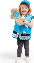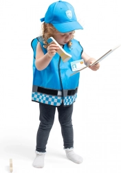 Dětský kostým policisty BIGJIGS TOYS podněcuje fantazii a rolové hraní. Modrá vesta s reflexními prvky, suchými zipy a detaily policejní výstroje doplněná o nastavitelnou bavlněnou čepici a dřevěné doplňky vytváří realistický zážitek z povolání policisty.