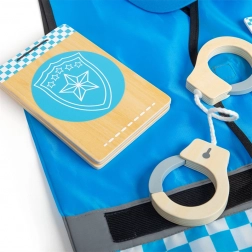 Součástí jsou dřevěná vysílačka, svítilna, pouta, identifikační odznak a peněženka na doklady – bezpečné a odolné doplňky pro malé ruce.
