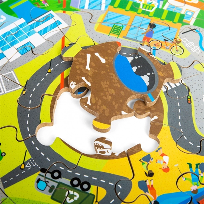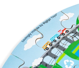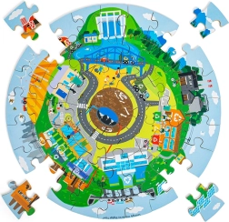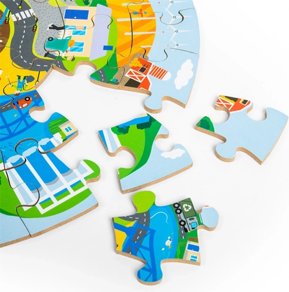 Kvalitní dřevěné puzzle v kruhovém tvaru je skvělou volbou pro první vzdělávací skládačky. Díky jasným barvám a poutavým scénám z města a přírody se děti snadno zorientují v tématu třídění odpadu a ochrany životního prostředí.