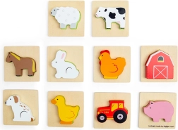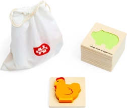 Tato cestovní hra na téma farma přináší dětem radost z objevování. Vloží ruku do látkového sáčku a podle hmatu hledají dílek, který pasuje do příslušné dřevěné podložky. Zábava, která nenápadně podporuje soustředění, koordinaci oko–ruka i slovní zásobu při pojmenovávání zvířat a předmětů z farmy.