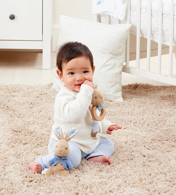 Toto stylové chrastítko a kousátko s králíčkem Peter Rabbit podporuje raný rozvoj miminka díky smyslové stimulaci. Kombinuje měkký, příjemný plyš ze 100% bavlny a pevný dřevěný kroužek z udržitelných zdrojů, který se dobře drží i drobnými dětskými ručkami.