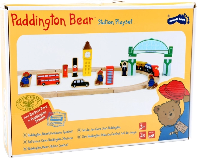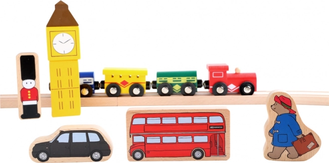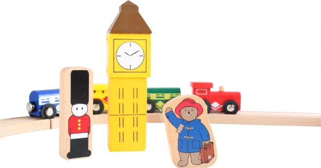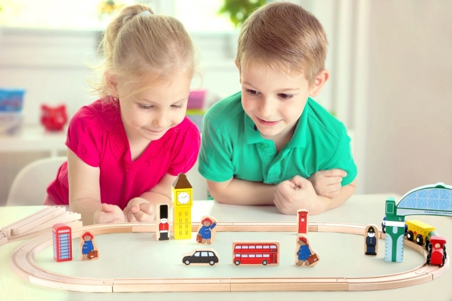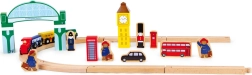 Objevte kouzlo britské metropole s kompletní dřevěnou vláčkodráhou, kde PADDINGTON vyráží z vlastní stanice na dobrodružnou jízdu. Součástí je bohaté příslušenství a barevné potisky známých londýnských symbolů, které dětem otevřou bránu k fantazii a tematické hře.
