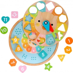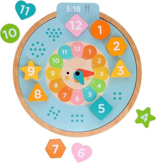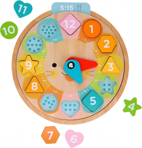 Obsahuje pohyblivé ručičky a tvary, které děti mohou vkládat na správná místa, což stimuluje koordinaci a jemnou motoriku.
