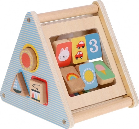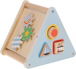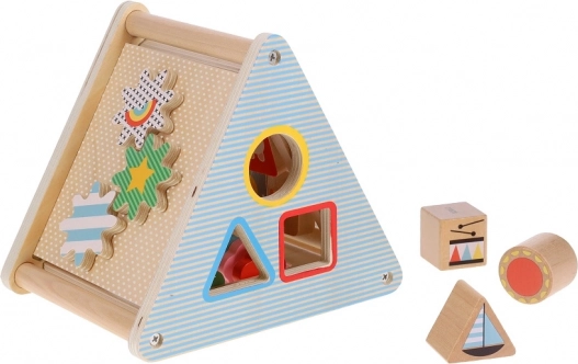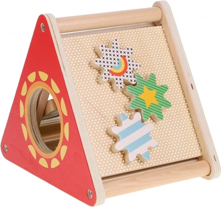 Hračka obsahuje různé vyřezané otvory pro vkládání tvarů a ozubená kola pro rozvoj jemné motoriky.