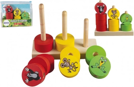 Veselé pyramidy Krtek nabízejí dětem skvělou příležitost k rozvoji jemné motoriky a kreativity. Tři barevné tyčky a 12 navlékatelných dílů s veselými motivy zaujmou každé dítě. Výrobek je vyroben z kvalitního dřeva, což zaručuje jeho tradiční a odolnou konstrukci.