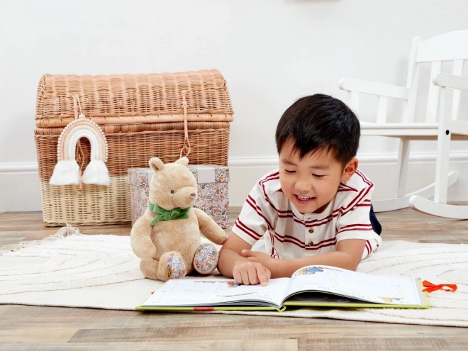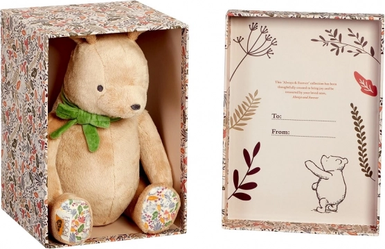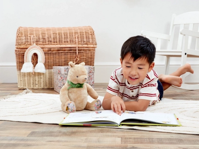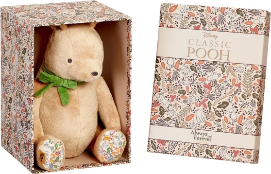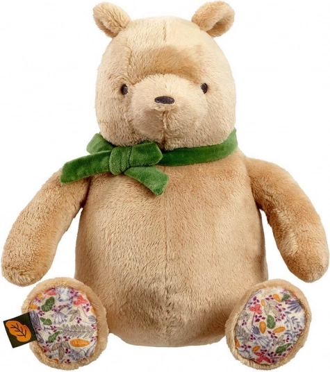 Roztomilý plyšový Medvídek Pú o velikosti 25 cm je vyroben z extra měkkých a udržitelných materiálů, s recyklovanou výplní pro bezpečné a šetrné mazlení. Stylová zelená mašle a květinové detaily na tlapkách dodávají hračce kouzlo. Ideální jako dárek pro novorozence, dodáván v dárkové krabičce s místem pro věnování.