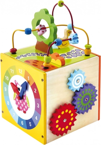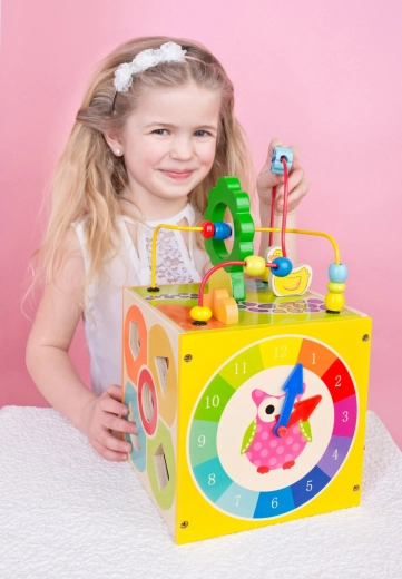 Multifunkční motorická kostka od značky Bino je kvalitní dřevěná hračka pro nejmenší, která rozvíjí jemnou motoriku, logické myšlení a soustředění. Nabízí různé aktivity na každé stěně, včetně vhazování a vkládání tvarů. Je vyrobena z kvalitního dřeva a opatřena nezávadnými barvami splňujícími normy EU.
