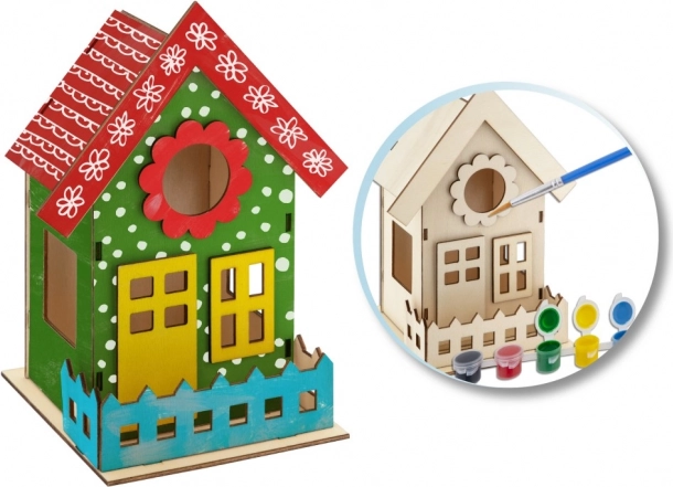 - Dřevěný domeček, 6 barev, lepidlo, štětec