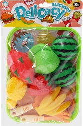 Zábavná a bezpečná krájecí sada ovoce pro malé kuchaře od 3 let. Obsahuje ovoce ke krájení, nůž, vidličku, krájecí prkénko a tác 22 × 16 cm – ideální pro rozvoj jemné motoriky a hraní na kuchyň.