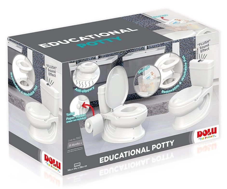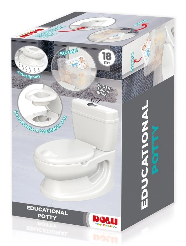 Součástí je funkční tlačítko se zvukem spláchnutí, které děti motivuje, boční držák na toaletní papír a úložný prostor v nádržce na drobnosti. Vyjímatelná vnitřní miska umožňuje rychlé a hygienické čištění, zatímco protiskluzová podložka zajišťuje stabilitu na podlaze.