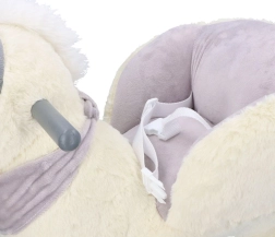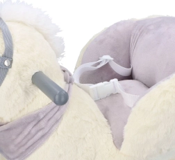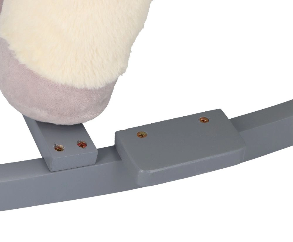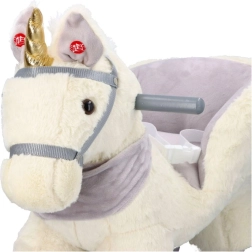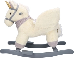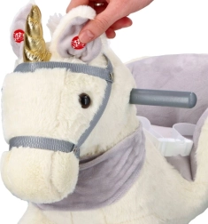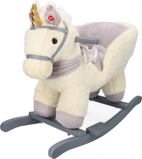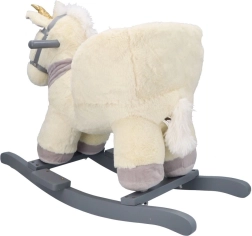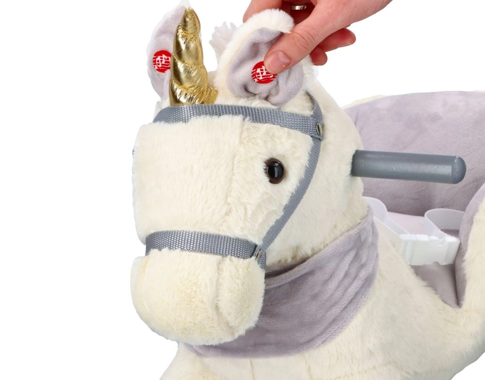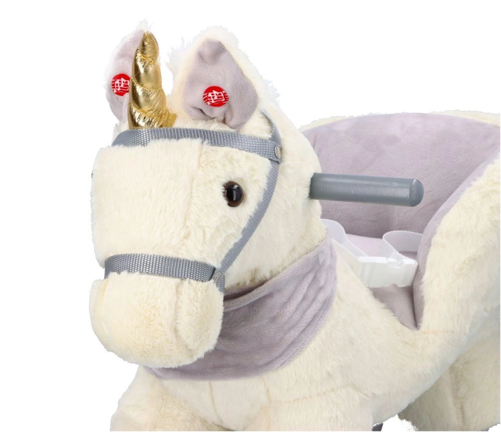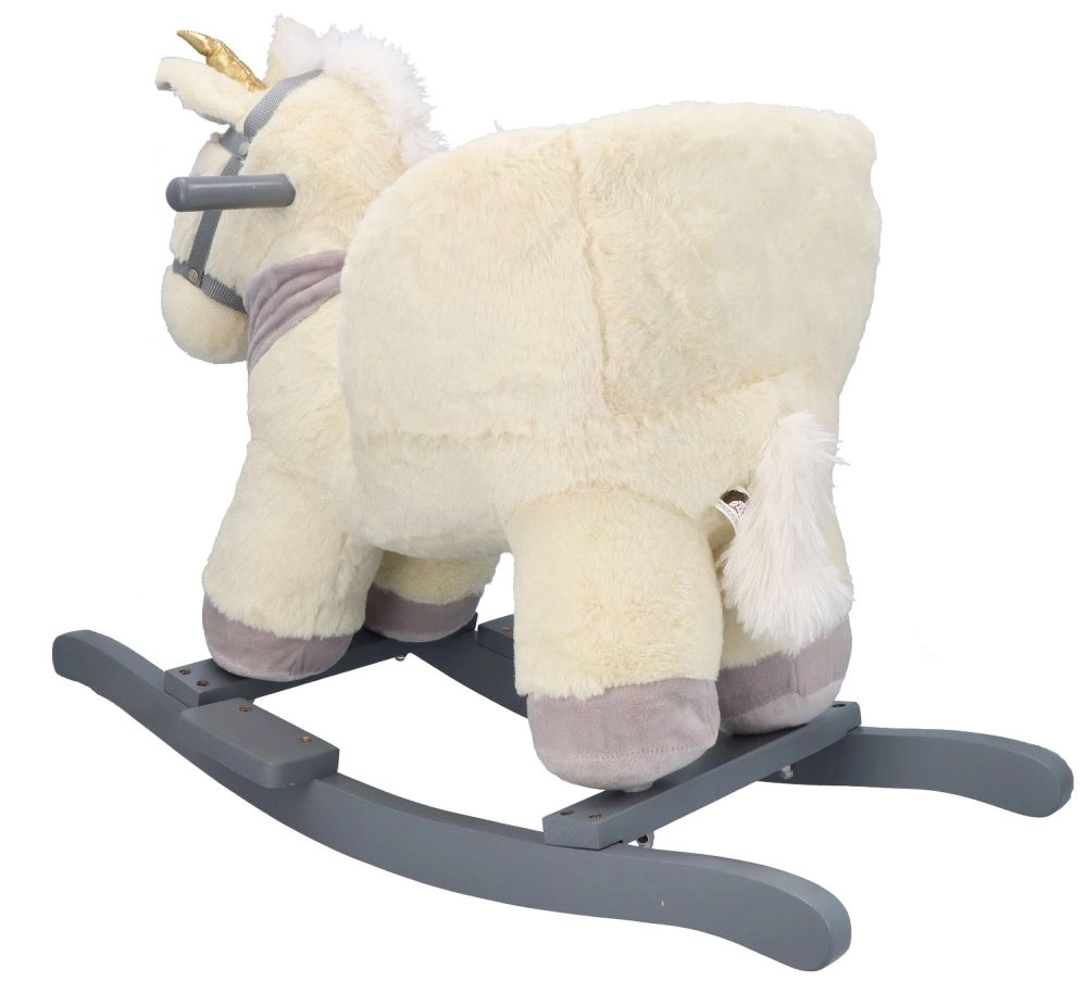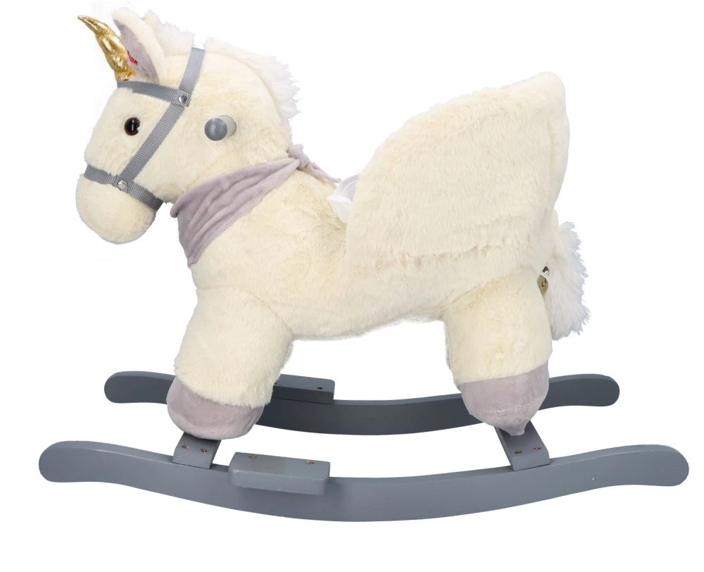 Tento plyšový houpací jednorožec se zlatým rohem a jemnými šedými detaily je ideální volbou pro domácí zábavu. Měkké sedátko s opěrkami a bezpečnostním pásem zajistí pohodlí i stabilitu, zatímco dřevěné lyžiny a úchyty poskytují jistý a plynulý pohyb.