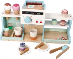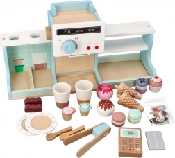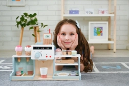 Tato dřevěná zmrzlinárna a kavárna nabízí dětem autentický zážitek z obsluhy malého bistra. Díky barevným doplňkům, otočným knoflíkům a realistickým prvkům kávovaru i stánku na zmrzlinu si děti procvičí jemnou motoriku, komunikaci a představivost.