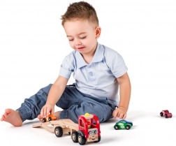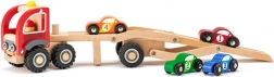 Souprava obsahuje tahač s nájezdem a čtyři barevná autíčka, která lze libovolně nakládat a vykládat. Gumová kola na přepravníku zaručují tichý a plynulý pohyb po podlaze, zatímco kompaktní rozměry se dobře drží i menším dětem.
