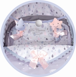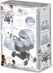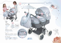 DeCuevas 85029 Skládací kočárek pro panenky se slunečníkem a doplňky Martin 2019 - 60 cm je z velmi úspěšné chlapecké kolekce Martin, pro kterou je typická kombinace šedé a světlounce modrofialové barvy s veselými bílými obláčky, růžovými hvězdičkami a bleděmodrými kapičkami. Výrobce při kombinaci těchto pastelových barev očividně myslel na využití pro panenky obou pohlaví.