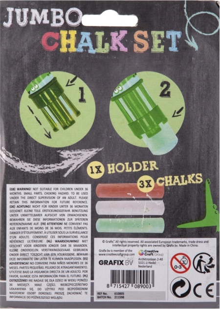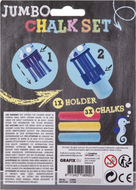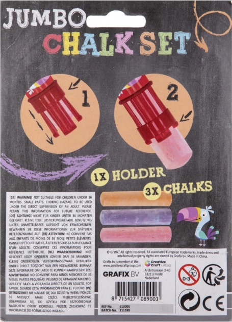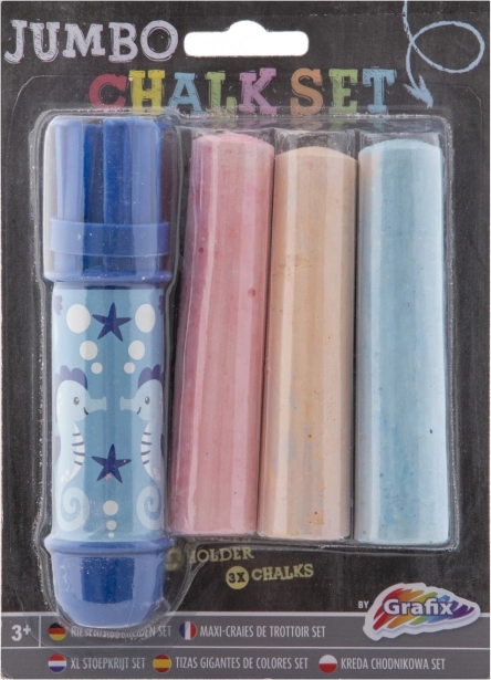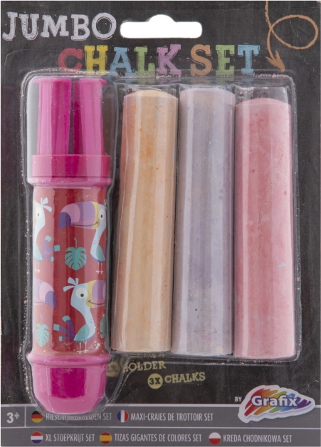 Objevte radost z kreslení na chodník, dvůr či školní hřiště. Extra silné křídy typu jumbo se skvěle drží a méně se lámou, držák navíc udrží ruce čisté a usnadní manipulaci i menším dětem. Balení obsahuje 3 křídy v různých barvách, které vytvářejí výrazné a rovnoměrné stopy.