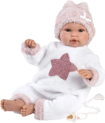 Roztomilá panenka LLORENS New Born 36 cm potěší realistickým zpracováním, měkkým látkovým tělíčkem a zvuky miminka. Po stisknutí hrudi říká „mama“, „papa“ a vydává autentický pláč. Má polohovatelné končetiny na kloubech, může i sedět a je ideální pro pečující hraní. Ručně vyrobeno ve Španělsku, dodáváno v dárkové krabici.