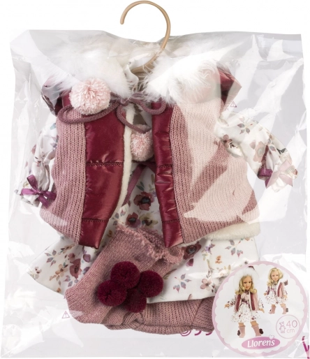 Elegantní 4dílný obleček pro panenky značky Llorens velikosti 40 cm, ručně vyrobený ve Španělsku. Perfektní doplněk pro malé milovnice panenek.