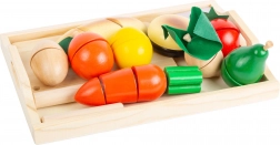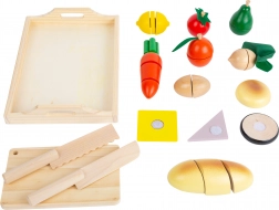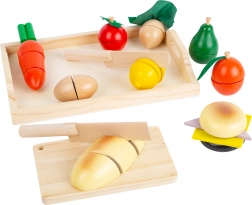 Každá potravina je rozdělena na části spojené suchým zipem – děti mohou bezpečně „krájet“ dřevěným nožem na prkénku a znovu vše snadno spojit.