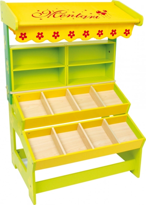 Módní barevný lakovaný prodejní stojanu z masivní překližky. Textilní markýza s červenými květy. Německá firma Legler zaměřená na výrobu kvalitních dřevěných hraček od roku 1996. Všechny dřevěné hračky značky small foot mají označení CE a jsou vyráběny dle evropské normy pro bezpečnost hraček EN 71. Použité barvy jsou speciálně vyvinuty pro dřevěné hračky a jsou odolné i proti slinám dětí. Dřevo, které se používá pro tyto hračky, většinou pochází z lesnických společností zapojených do zalesňování. To nabízí všem zákazníkům možnost přispět k zachování přirozeně rostoucích lesů. Dřevěné hračky small foot jsou zářivě barevné produkty, které jsou vyrobeny převážně z přírodních surovin - dřeva. Dětem dělají radost od útlého věku, rozvíjí jejich hmatové a smyslové dovednosti. Cílem značky small foot je podporovat duševní a fyzický vývoj dětí.