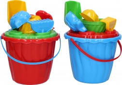 - Kyblík 16 × 13 cm, sítko, hrábě, lopatka, 3 formičky (rybka, kačenka, bábovka)