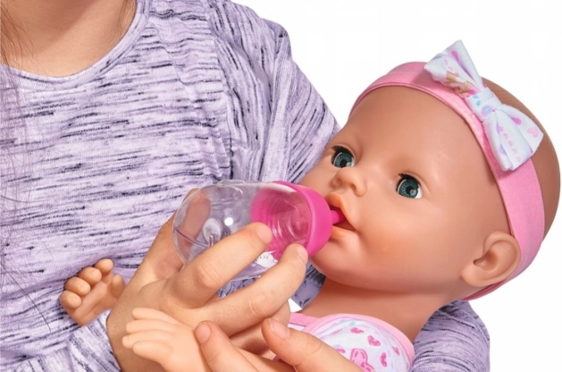 Panenka se skutečně „napije“ z přiložené lahvičky, což dělá hru přirozenou a zábavnou. Skvělé pro nácvik pečujících rituálů.