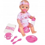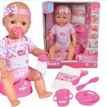 Součástí je vše potřebné pro každodenní hraní: láhev, dudlík, kelímek, miska, lžička, vidlička, nočník a plenka. Děti mohou miminko krmit, napájet, uklidňovat dudlíkem, přebalovat i posazovat na nočník – to vše podporuje role-play, rozvoj jemné motoriky a zodpovědnosti.