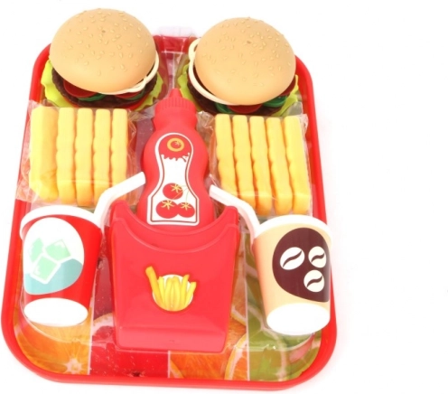 - Hamburger, plastové hranolky, tác a doplňky