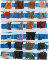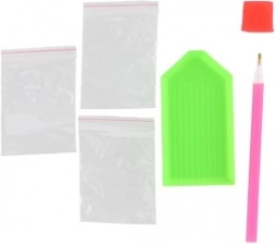 - Plátno s předtištěným motivem a lepicí vrstvou, aplikační pero, miska, vosk, sada barevných kamínků, legenda symbolů