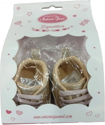 Tyto zlaté tenisky s roztomilým jednorožcem jsou perfektním doplňkem pro panenky – miminka o velikosti 40–52 cm. Díky univerzální délce 7,5 cm snadno padnou většině oblíbených modelů panenek a pomohou rozvíjet fantazii, jemnou motoriku a samostatnost při oblékání a hře.