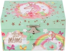 Kouzelná hrací šperkovnice s motivem jednorožce v pastelově zelené barvě potěší každou malou parádnici. Po natažení klíčku se uvnitř roztáčí figurka jednorožce a zazní jemná melodie. Uvnitř najdete zrcátko, přehledné přihrádky a praktickou zásuvku na drobné poklady. Odolná kartonová konstrukce, kovové prvky a půvabné ilustrace duhy, hvězdiček a motýlků skvěle doladí dětský pokoj.