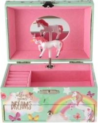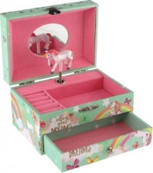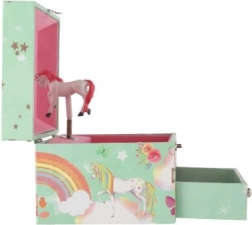 Tato stylová hrací šperkovnice s jednorožcem je ideální pro ukládání prstýnků, náušnic a drobných tajemství. Po otevření víka se zrcátkem se po natažení klíčku roztočí bílý-růžový jednorožec a zazní jemná hudba. Vnitřek nabízí členěný prostor na šperky, zatímco spodní zásuvka pojme další cennosti.