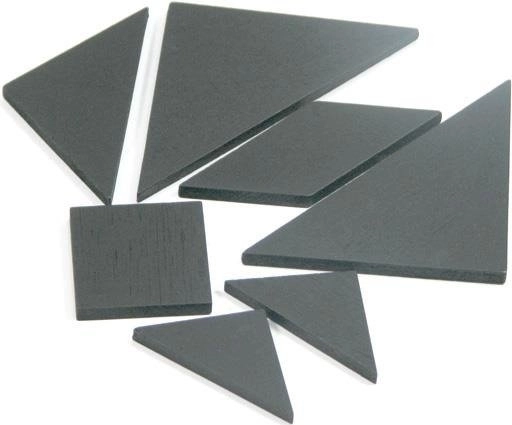 Sedm odolných dřevěných dílků v černé barvě vytváří výrazné kompozice a příjemně se s nimi manipuluje.