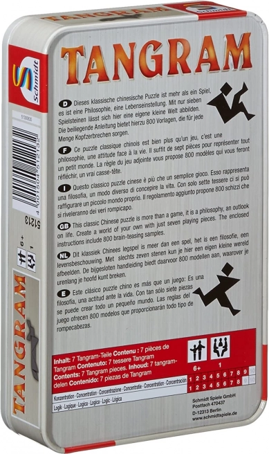 Součástí balení je brožura s 800 předlohami a řešeními, která vám pomůže, když si nebudete vědět rady. Praktická plechová krabička chrání dílky a usnadňuje přenášení, takže je tangram skvělou volbou na cesty, do školy i do kanceláře.