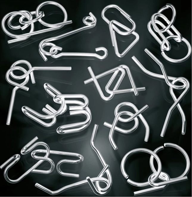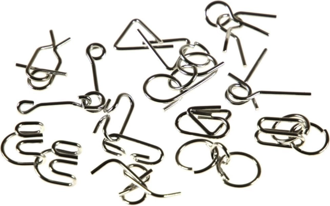 - 12 kovových hlavolamů v kompaktní krabičce
