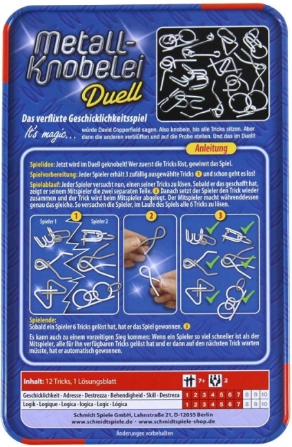 Tato sada SCHMIDT Metall-Knobelei Duell přináší dvanáct chytře navržených kovových hlavolamů v praktické plechové krabičce. Každý kousek prověří vaši trpělivost, logiku a jemnou motoriku: nejprve dvě části bez použití síly oddělte a poté je vraťte zpět do původního tvaru. Díky přiloženému ilustrovanému návodu můžete kdykoli nahlédnout pro nápovědu.