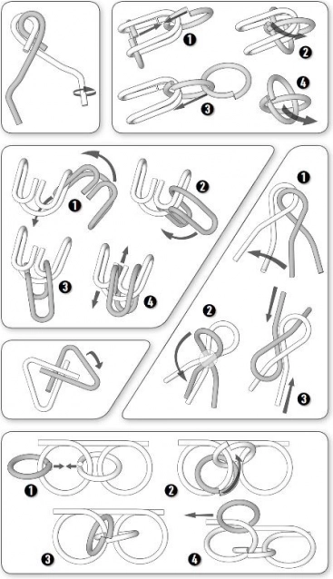 - 12 kovových hlavolamů, plechová krabička, graficky znázorněné řešení