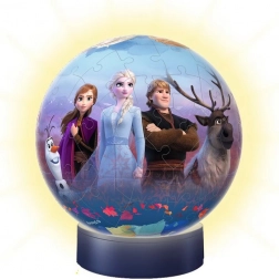 Objevte kouzlo s Ravensburger 3D Puzzle Ball® Ledové království 2, který se po tlesknutí rozsvítí. Díky dokonalé preciznosti 72 plastových dílků vytvoříte pevnou kouli bez potřeby lepidla. Speciální zahnuté dílky zajišťují, že vše perfektně pasuje a koule je po sestavení stabilní.